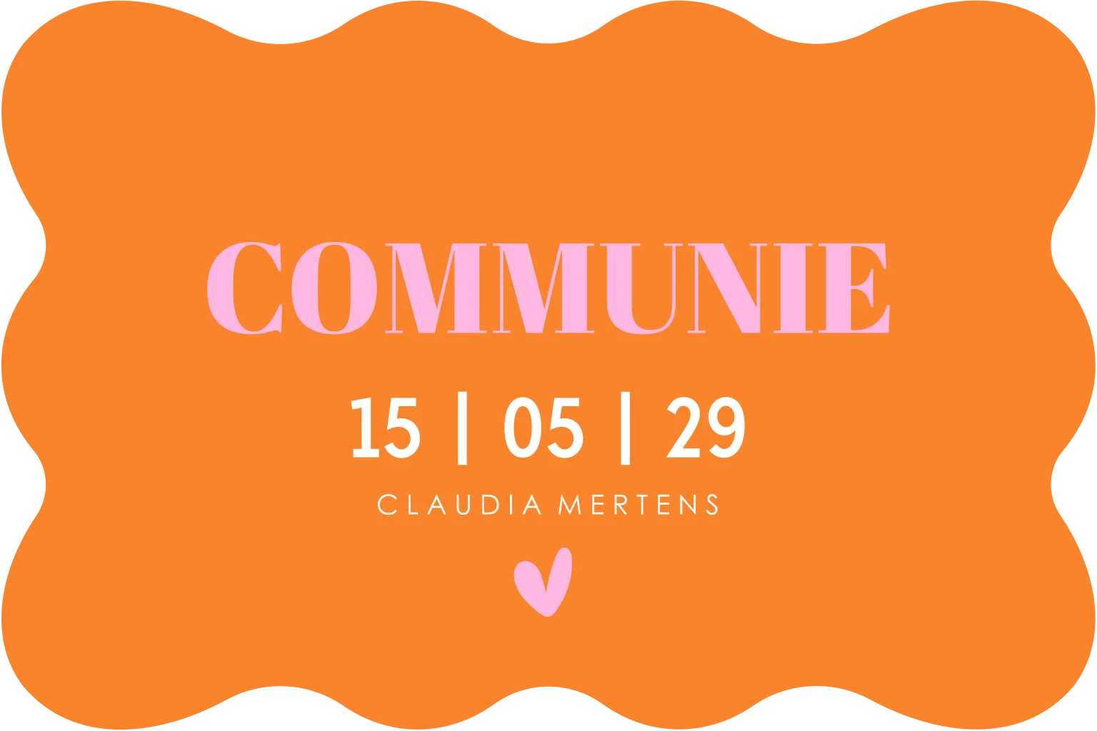 Communiekaart voor een meisje oranje roze met golvend kader. Pas de kleuren naar wens aan.