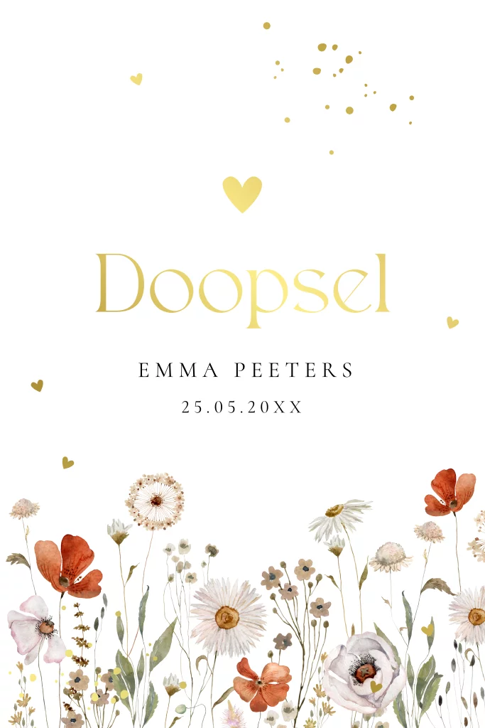 Doopkaart voor een meisje in de vorm van een boog met veldbloemen wit, rood en goudfolie. Nodig jullie gasten uit met deze bohemian doop uitnodiging!