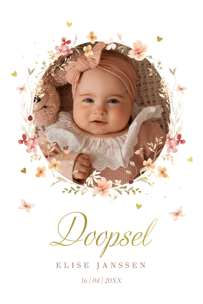 Doopkaart uitnodiging voor een meisje met eigen foto, boog vorm, bloemen en vlinders roze met goudfolie.