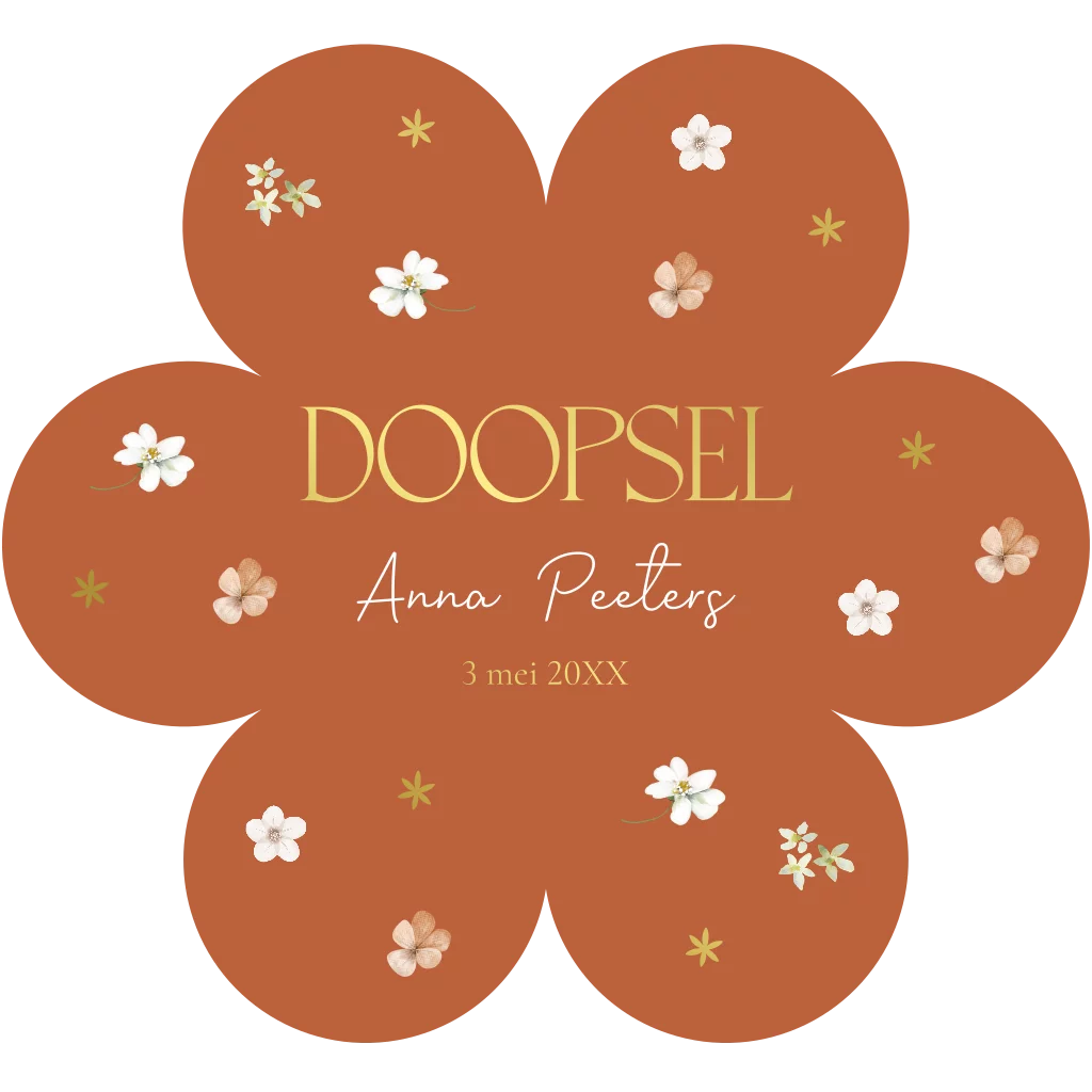 Doopkaart voor een meisje in de vorm van een bloem met goudfolie.
