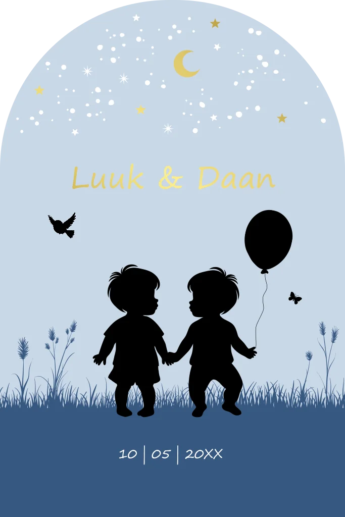 Lief en origineel geboortekaartje beige groen voor een tweeling meisje jongen met silhouet, boom, wolkjes, gras en dieren. Pas de kleuren naar wens aan!