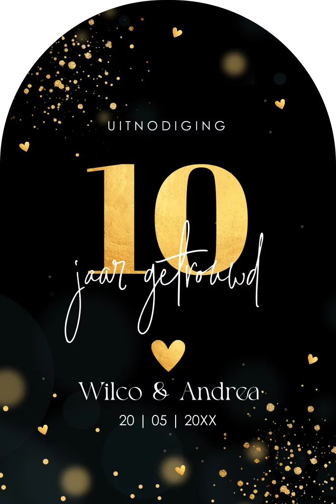 Jubileum uitnodiging 10 jaar getrouwd zwart in boog vorm met spetters in goudlook. Geen folie!