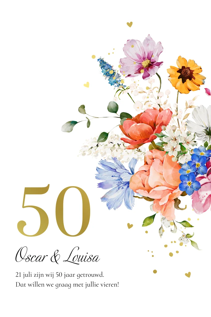 Jubileum uitnodiging 50 jaar getrouwd met mooie kleurrijke bloemen en goudfolie.