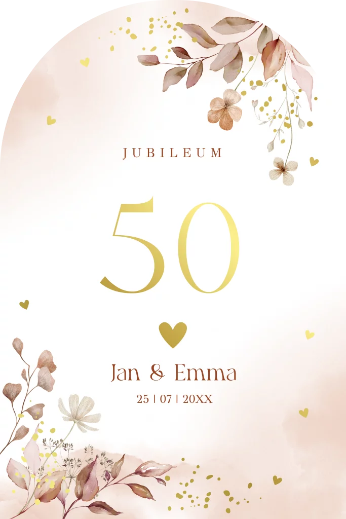 Uitnodiging huwelijk jubileum kaart in boog vorm met 50 jaar getrouwd, roze watercolour, bloemen en goudfolie. Pas het jaartal naar wens aan!