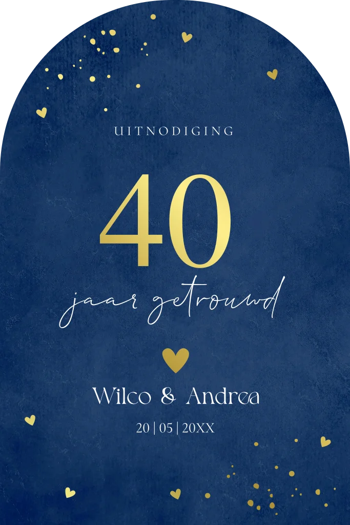 Uitnodiging huwelijk jubileum blauw in boog vorm met 40 jaar getrouwd en spetters met goudfolie.