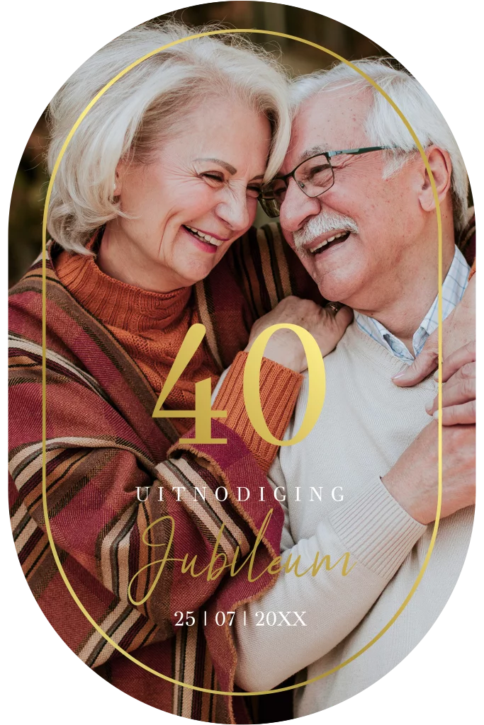 Uitnodiging huwelijk jubileum kaart in ovaal vorm met 40 jaar getrouwd, eigen foto en goudfolie.