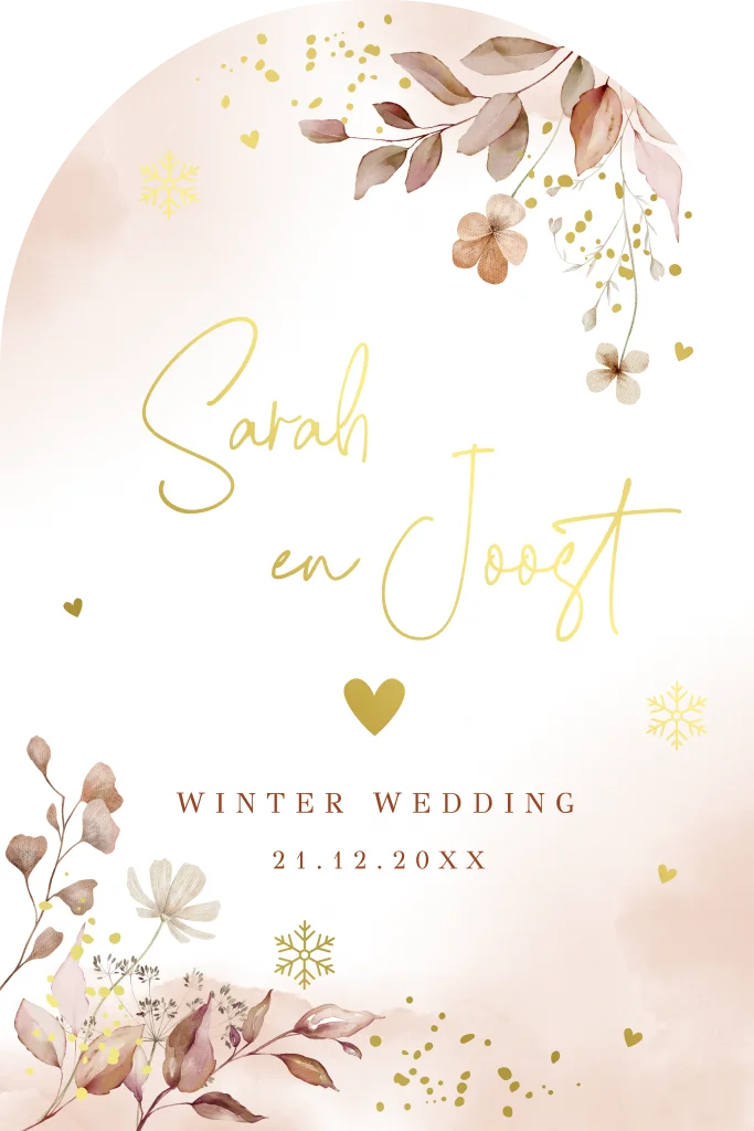 Winter wedding trouwkaart in de vorm van een boog met terracotta kleur bloemen en goudfolie. Nodig jullie gasten uit met deze originele trouwkaart met kerstgroet!