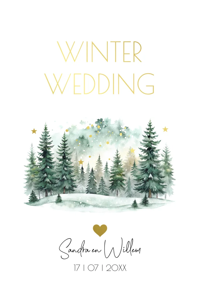 Winter Wedding trouwkaart in ovaal vorm met forrest trees groen en goudfolie.
