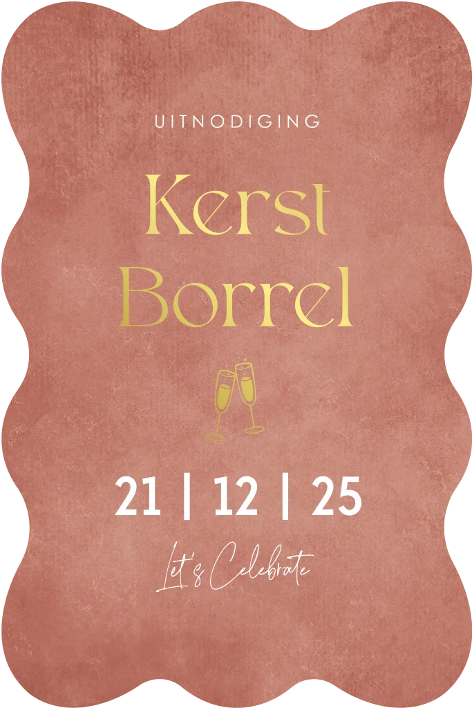 Kerstborrel uitnodiging terracotta met golvend kader en goudfolie.