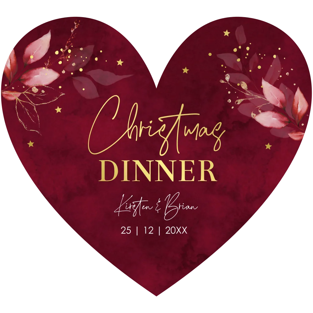 Kerstdiner uitnodiging in de vorm van een hartje rood met botanische watercolor bladeren en goudfolie.