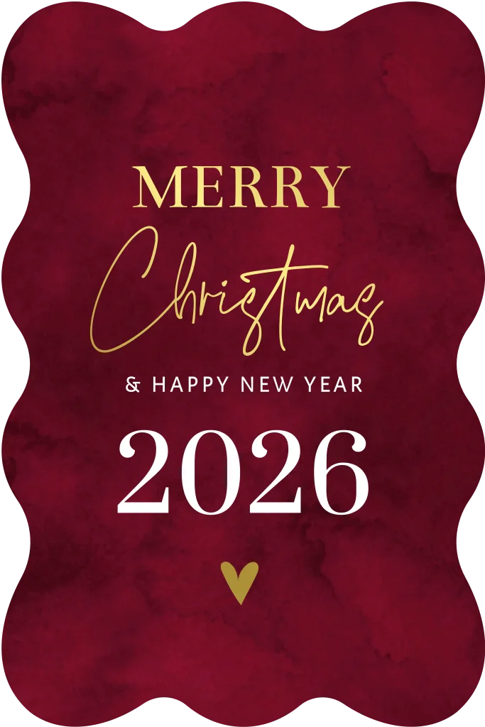 Kerstkaart rood in originele vorm golvend met luxe goudfolie.