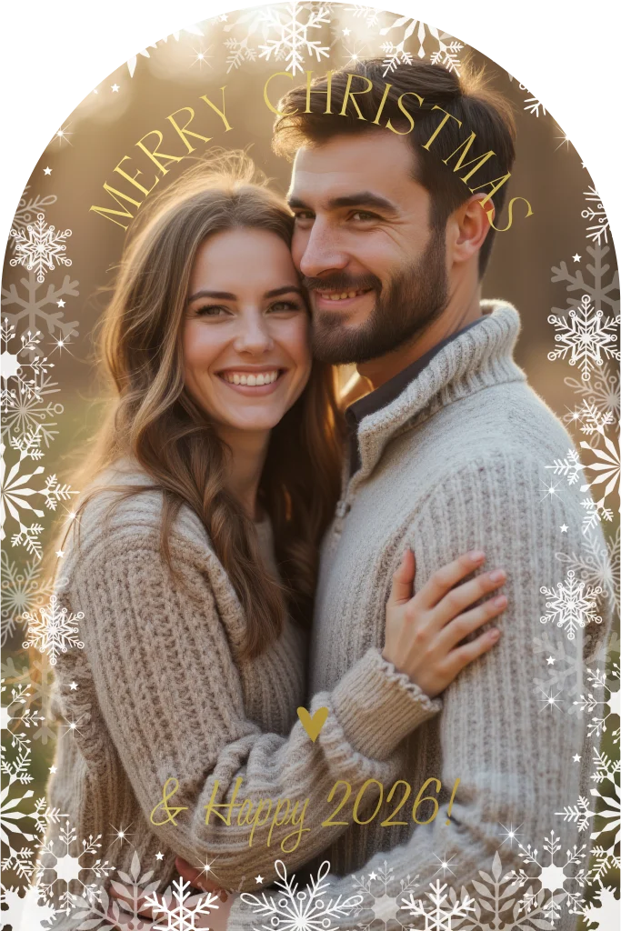Kerstkaart met foto in boog vorm en goudfolie.