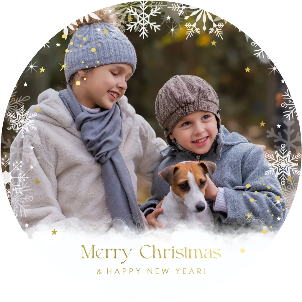 Een bijzondere kerstkaart in een ronde vorm met eigen foto en goudfolie. Liever een andere kleur foliedruk? Pas deze eenvoudig aan in onze ontwerptool.