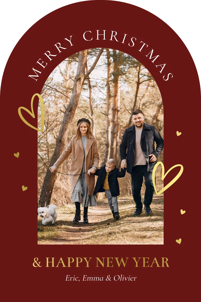 Mooie persoonlijke kerstkaart rood in originele boog vorm met foto en luxe goudfolie.