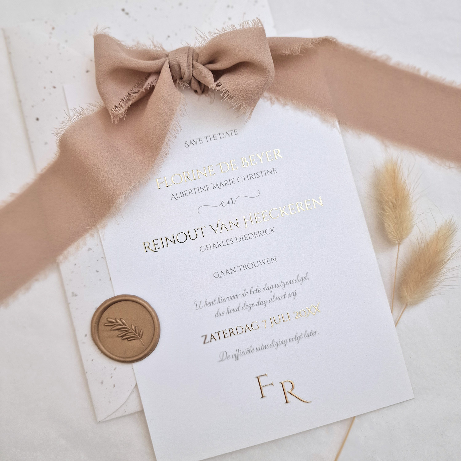 Klassieke Save the Date kaart wit lint initialen logo goudfolie