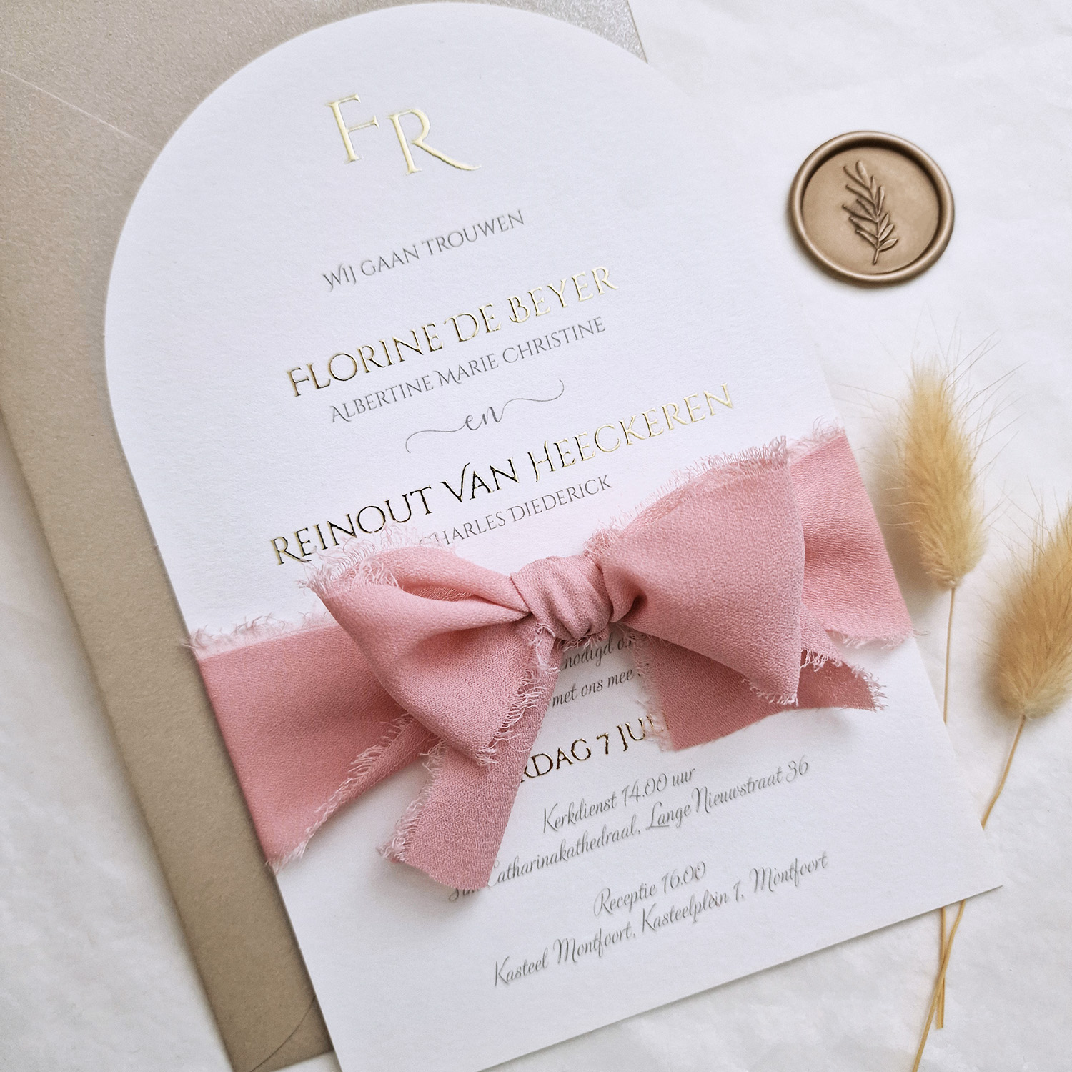 Klassieke trouwkaart wit in boog vorm met initialen en goudfolie. Maak deze je trouwkaart extra speciaal met een mooi zijden lint.
