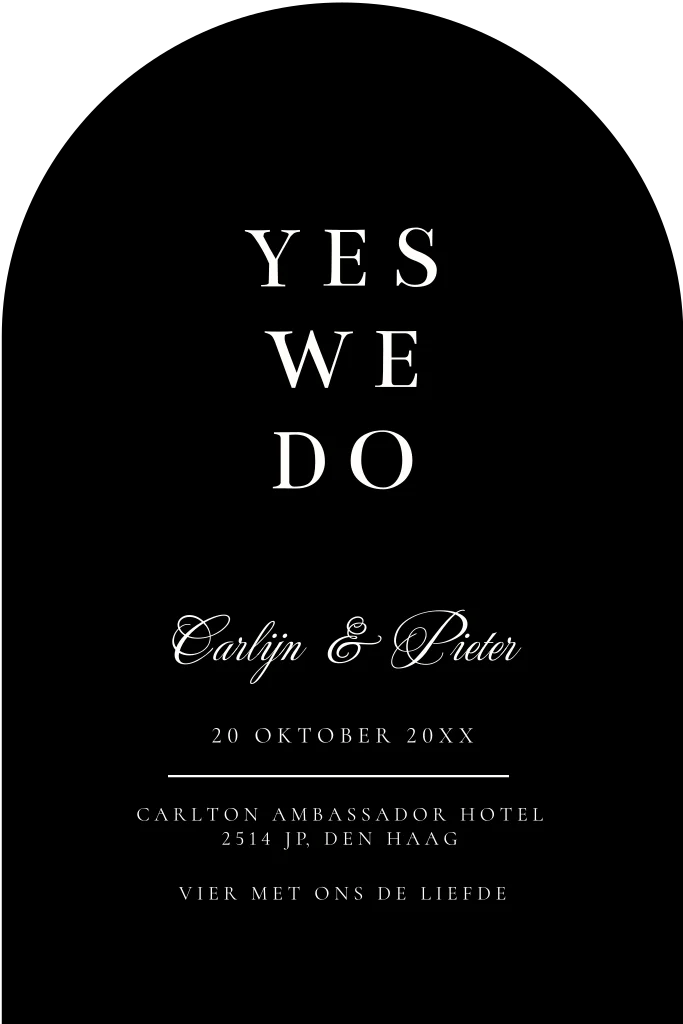 Klassieke trouwkaart zwart wit in originele boog vorm. Nodig jullie gasten in stijl uit met deze elegante trouwkaart. Pas de kleuren naar wens aan.