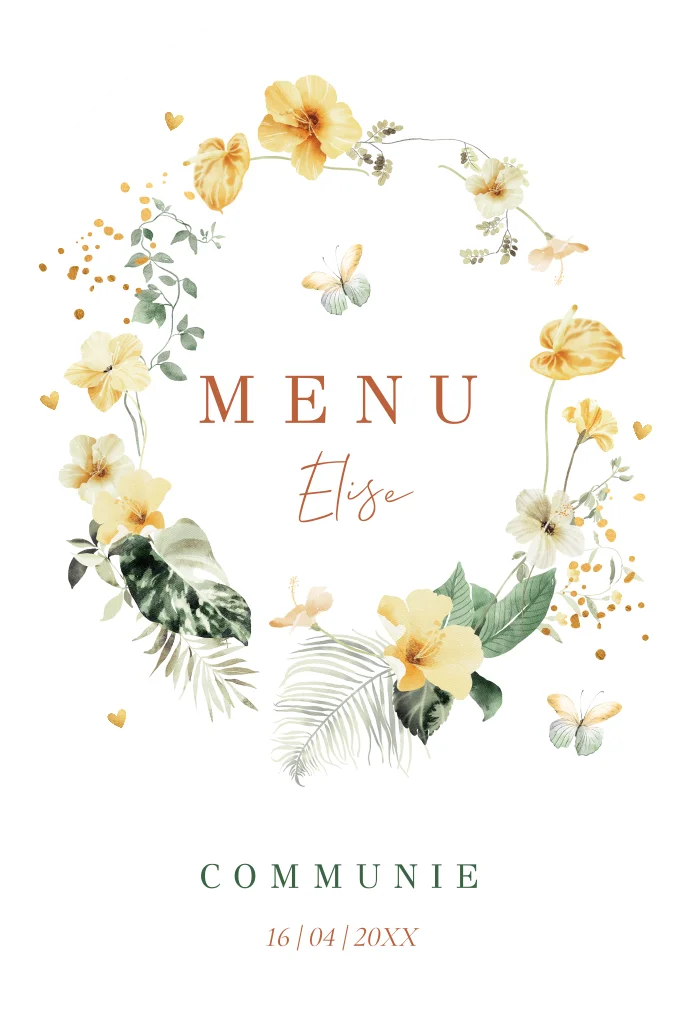 Menukaart communie voor een meisje in boog vorm met tropische bladeren, gele bloemen en vlinders.