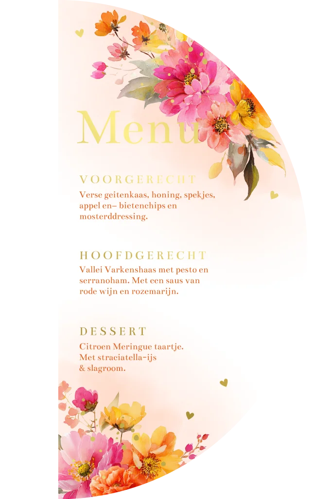 Menukaart half rond kleurrijke bloemen pink orange goudfolie
