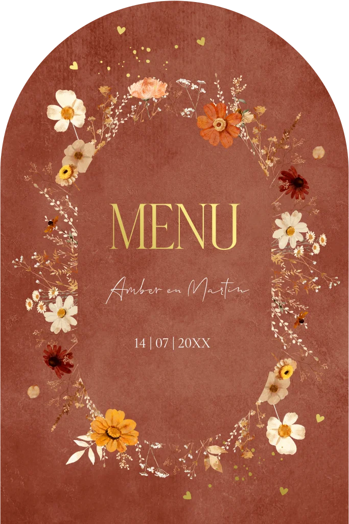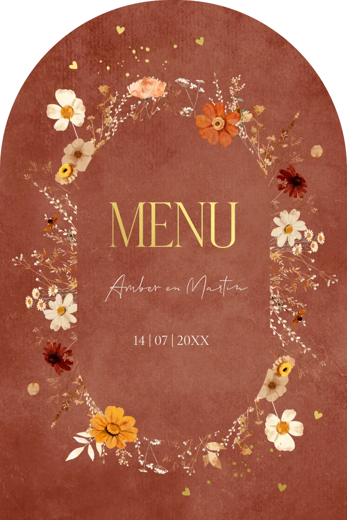 Menukaart huwelijk boog watercolour bloemen roestbruin goudfolie
