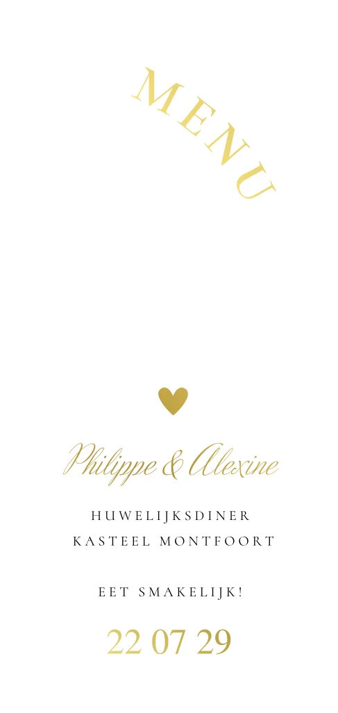 Stijlvolle menukaart huwelijk wit in halve boog met luxe goudfolie.