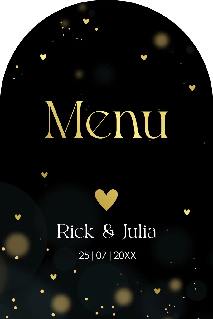 Menukaart huwelijk zwart goudfolie hartjes boog