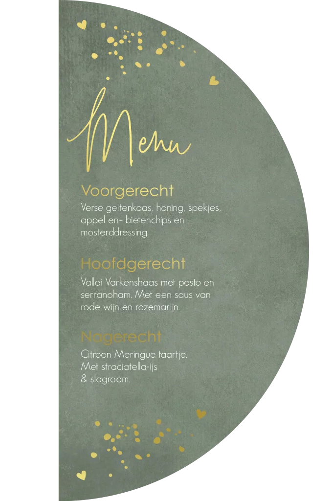 Menukaart in originele vorm rond met groene achtergrond en goudfolie.