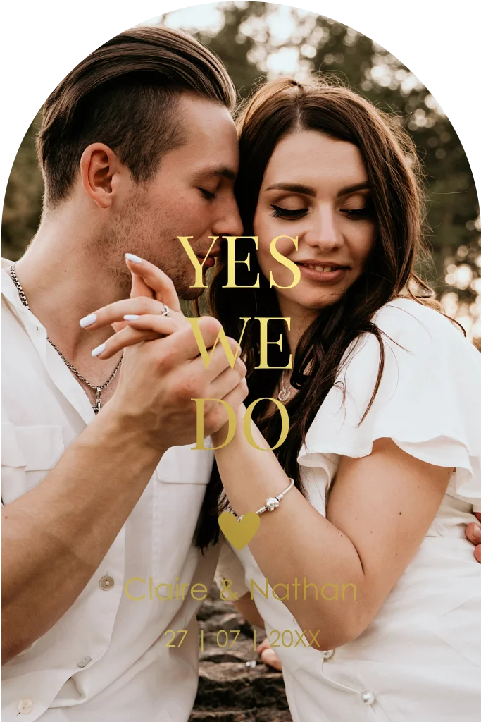 Trouwkaart met eigen foto en goudfolie. De kaart wordt gestanst in een unieke boog vorm. Pas de kleur van de kaart en de folie naar wens aan.