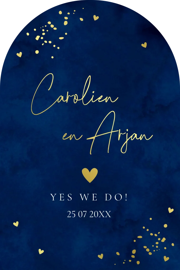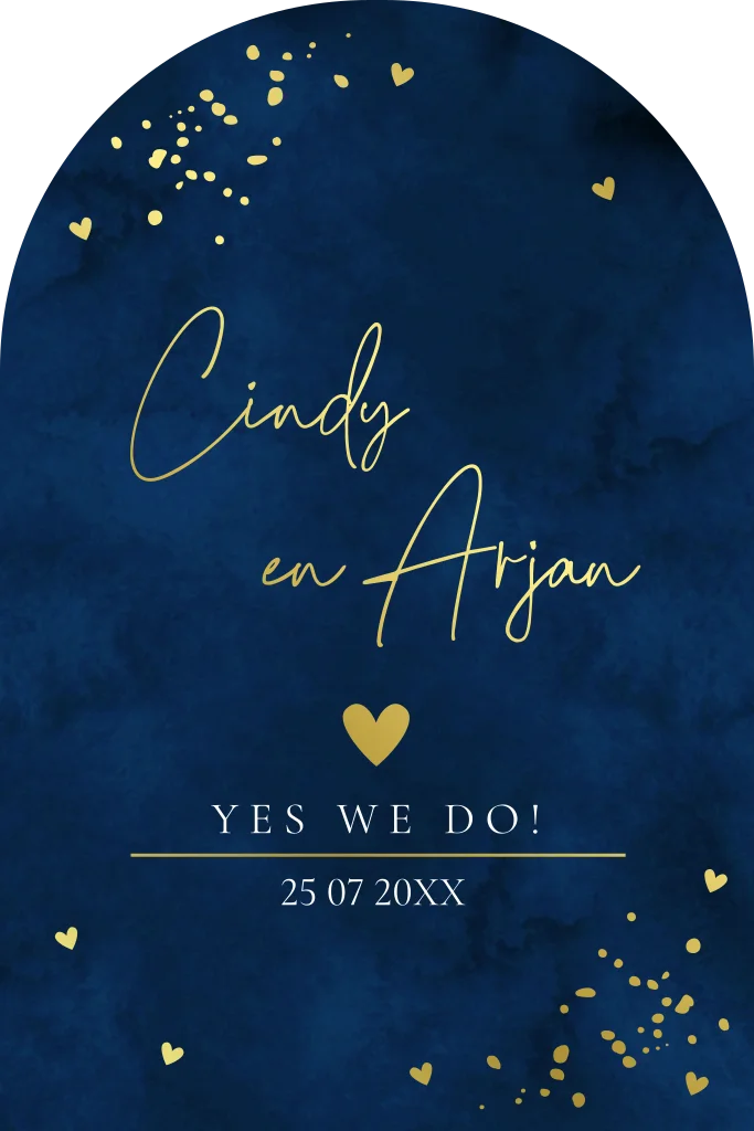Stijlvolle trouwkaart in boog vorm donkerblauw met goudfolie. Nodig jullie gasten uit met deze stijlvolle trouwkaart!
