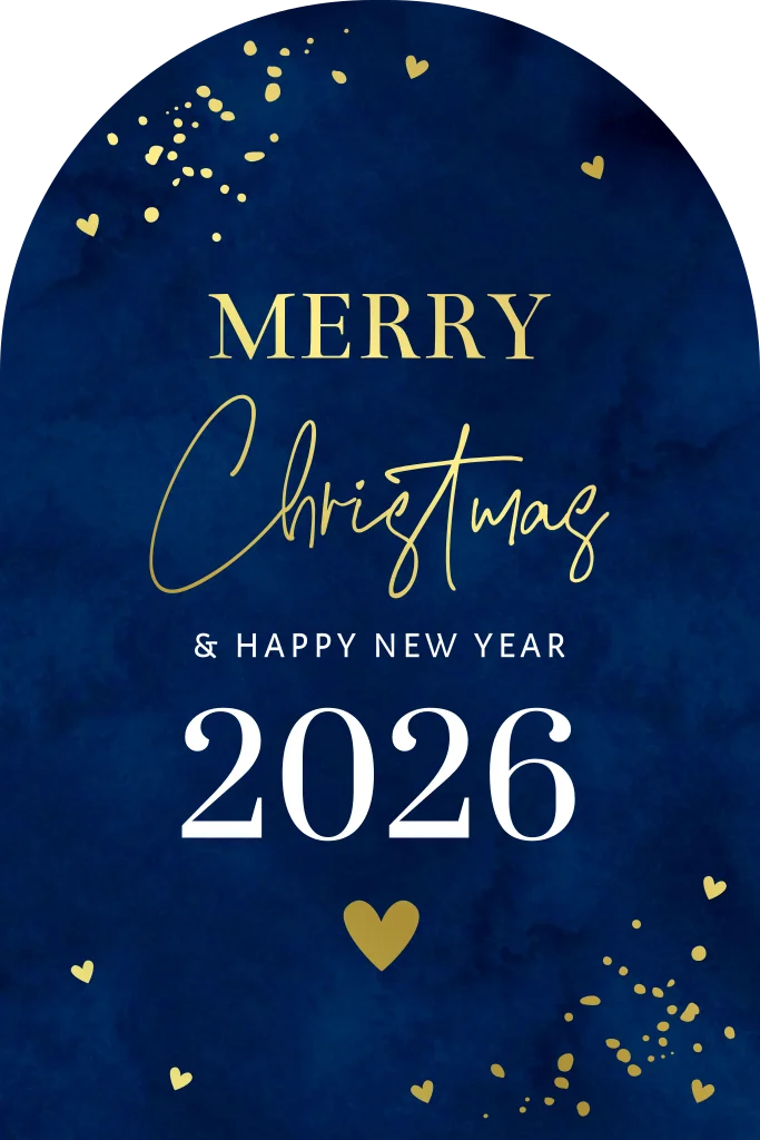 Moderne kerstkaart blauw in originele vorm boog met goudfolie.