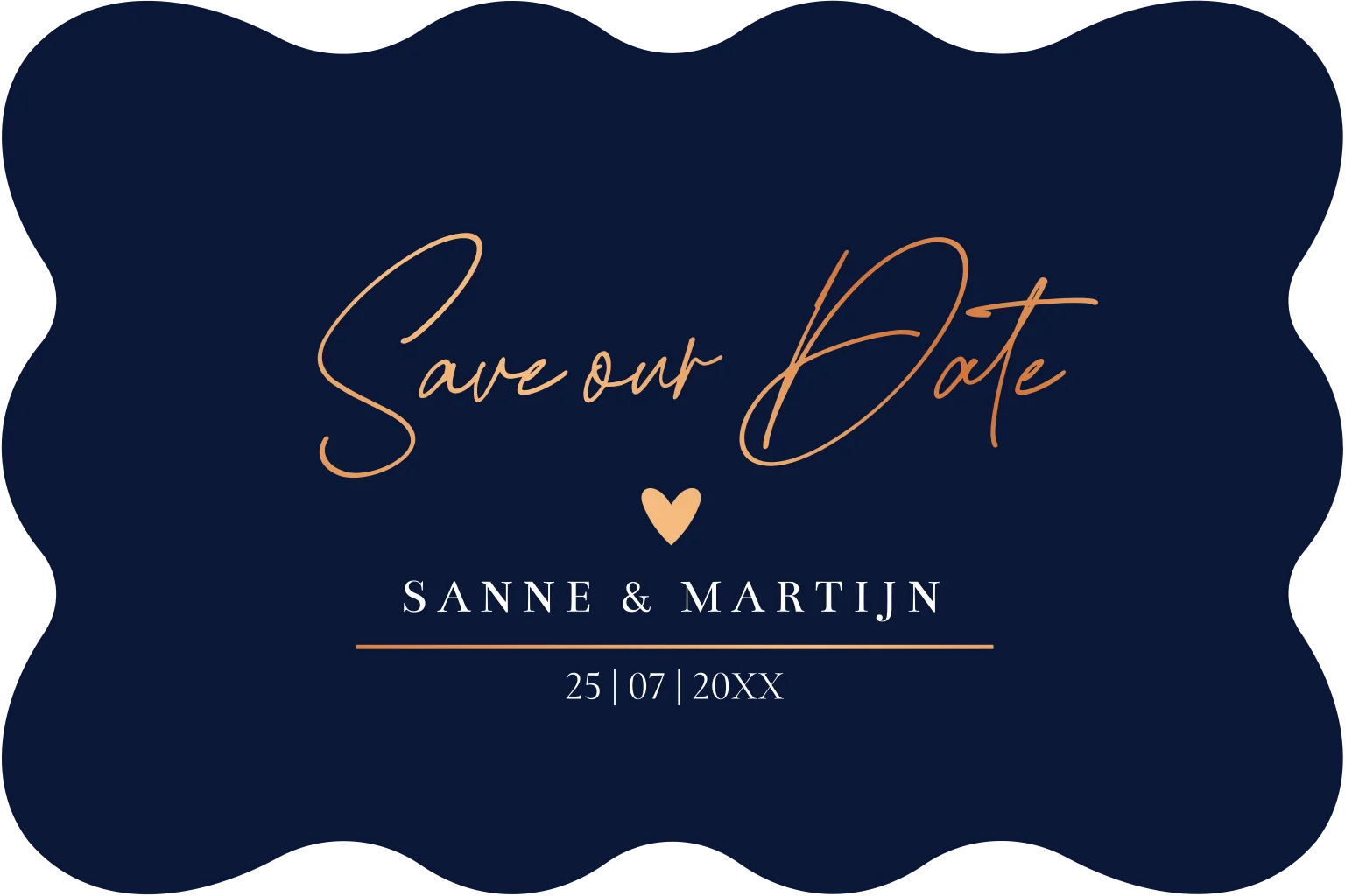 Save the Date kaart blauw in originele vorm golvend met luxe foliedruk.