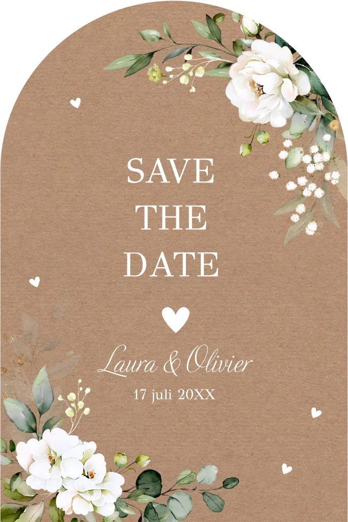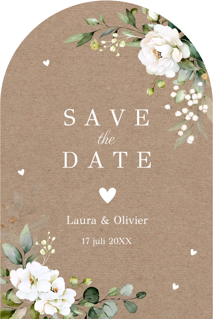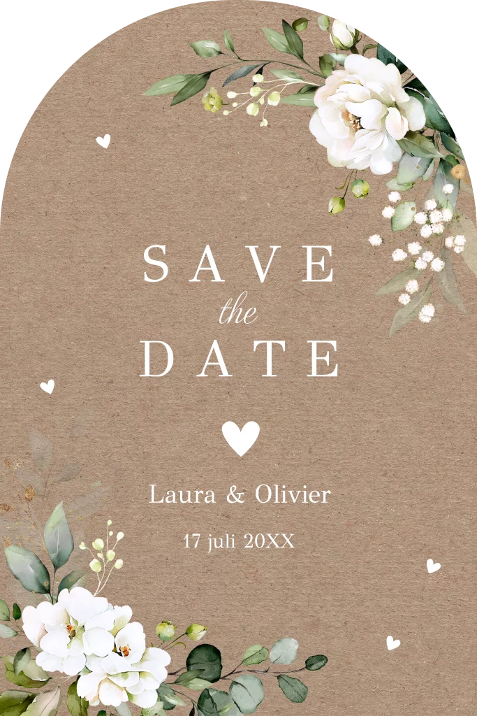 Save the date kaart in boog vorm botanisch met kraft look en witte bloemen.