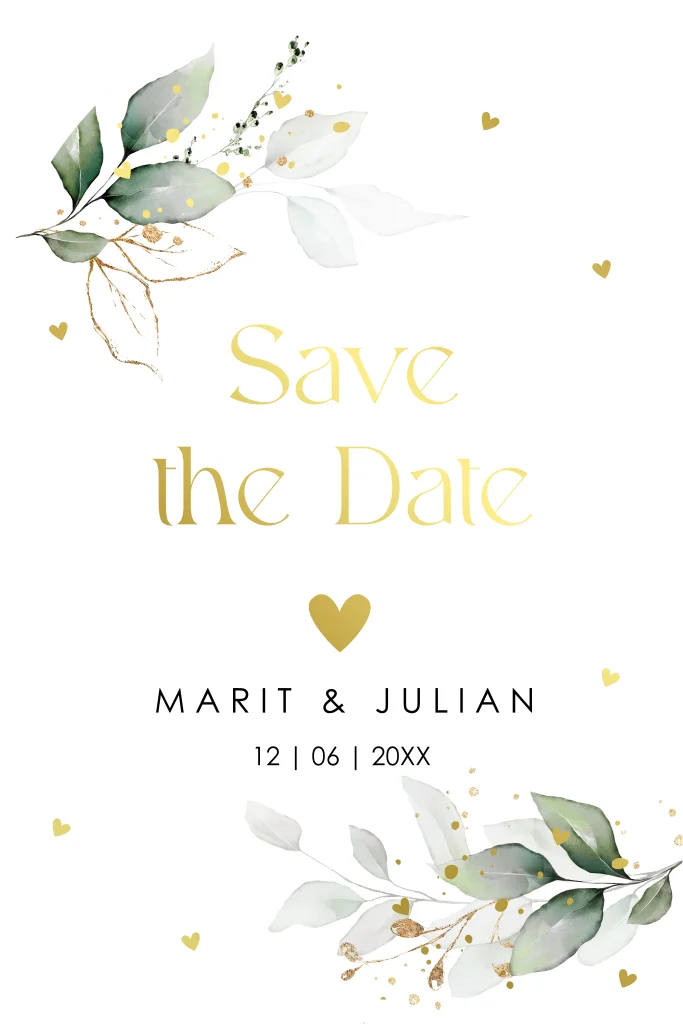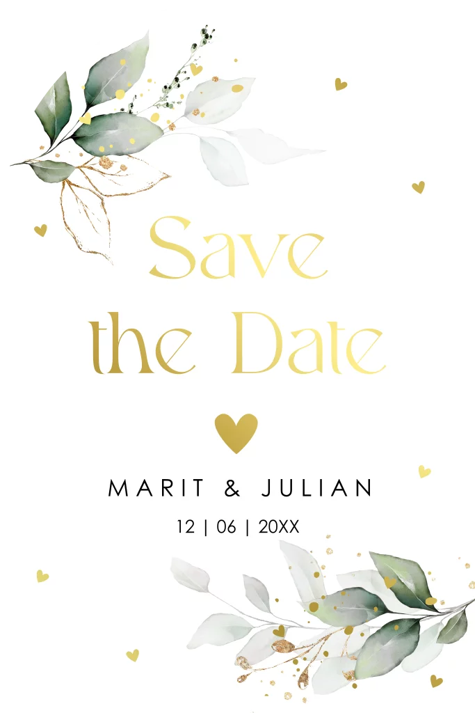 Save the Date kaart wit groen botanisch bladeren boog goudfolie