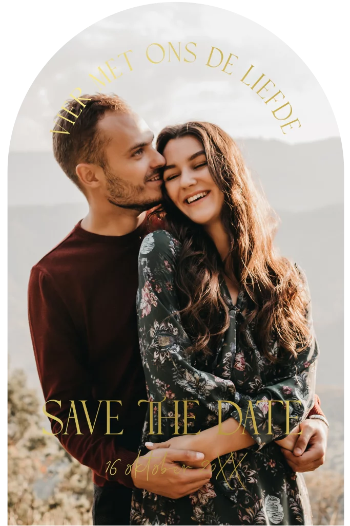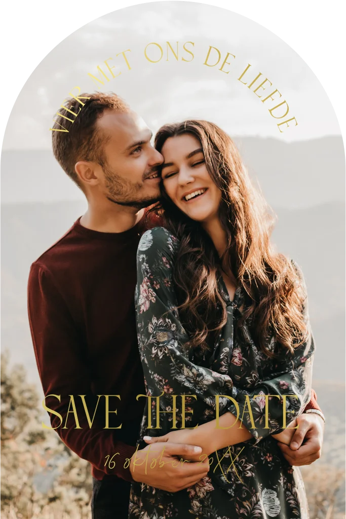Save the Date in een unieke vorm met foto en goudfolie opdruk. Vier de liefde met deze prachtige Save the Date uitnodiging! Liever een andere kleur foliedruk? Pas deze eenvoudig aan in onze ontwerptool.