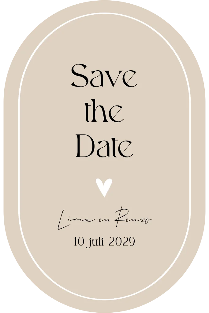Save the Date uitnodiging in speciale ovaal vorm met neutrale kleuren beige. Maak jullie trouwdatum bekend met deze stijlvolle save the date!