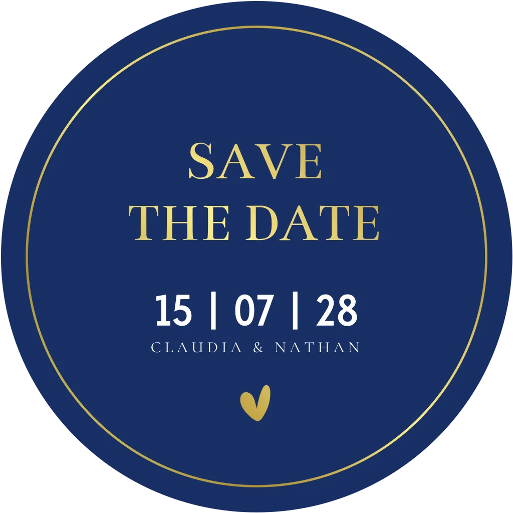 Save the Date kaart rond donkerblauw met luxe goudfolie. Maak jullie trouwdatum bekend met deze stijlvolle save the date uitnodiging. Pas de kleuren naar wens aan.