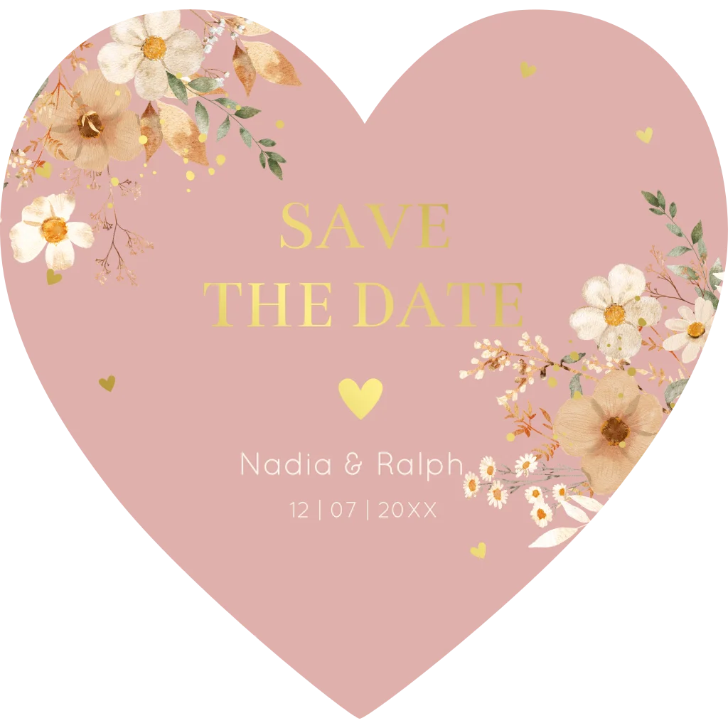 Save the Date kaart in de vorm van een hartje roze met bloemen en luxe goudfolie.