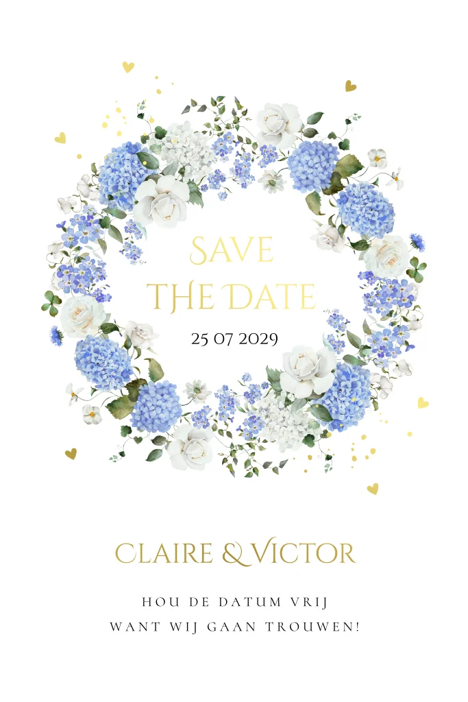Save the Date kaart wit bloemen blauw hortensia landelijk goudfolie