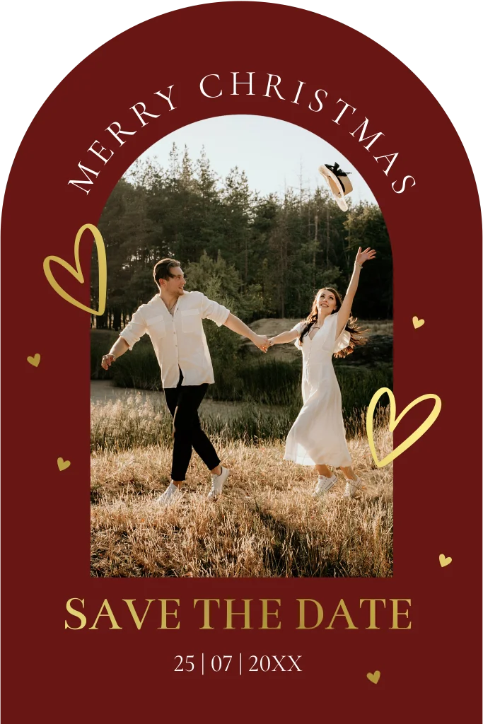Save the Date kerstkaart rood in boog vorm met eigen foto, hartjes en goudfolie. Maak jullie trouwdatum bekend met deze prachtige save the date!