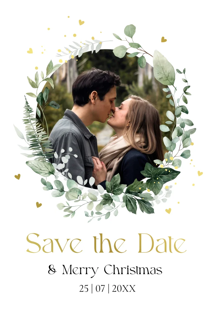 Save the Date kerstkaart wit in boog vorm met eigen foto, botanische krans van bladeren en goudfolie. Maak jullie trouwdatum bekend met deze prachtige save the date!