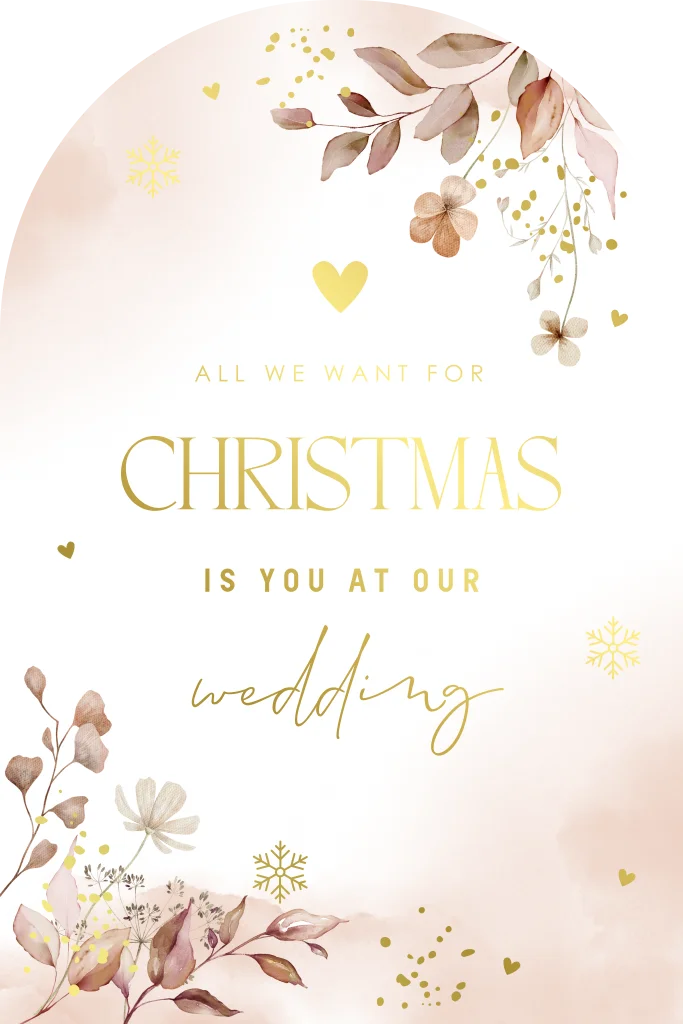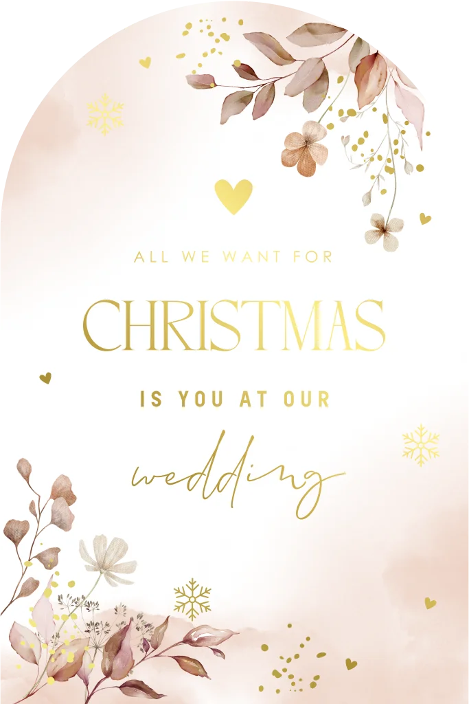 Save the Date kerstkaart in de vorm van een boog met terracotta kleur bloemen en goudfolie. Nodig jullie gasten uit met deze originele trouwkaart!