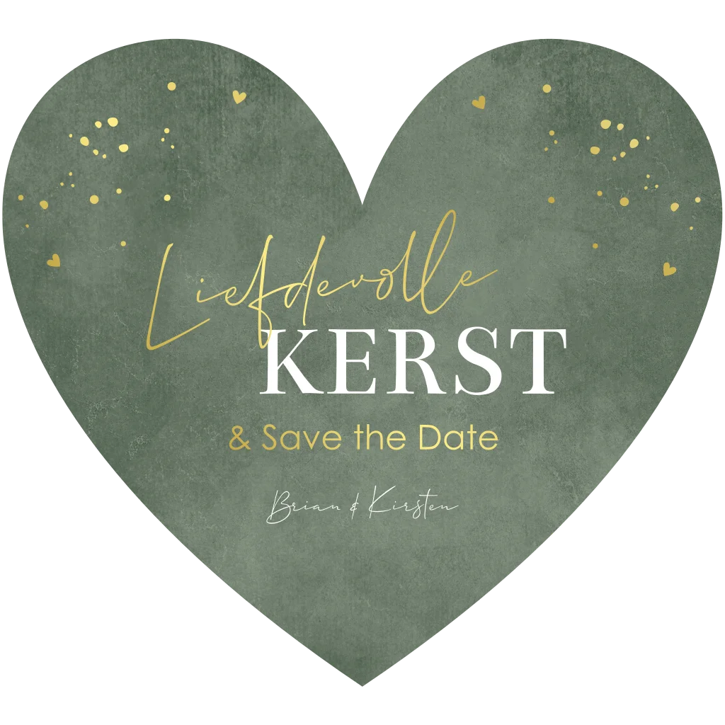 Mooie originele Save the Date kerstkaart in de vorm van een hartje groen met goudfolie.