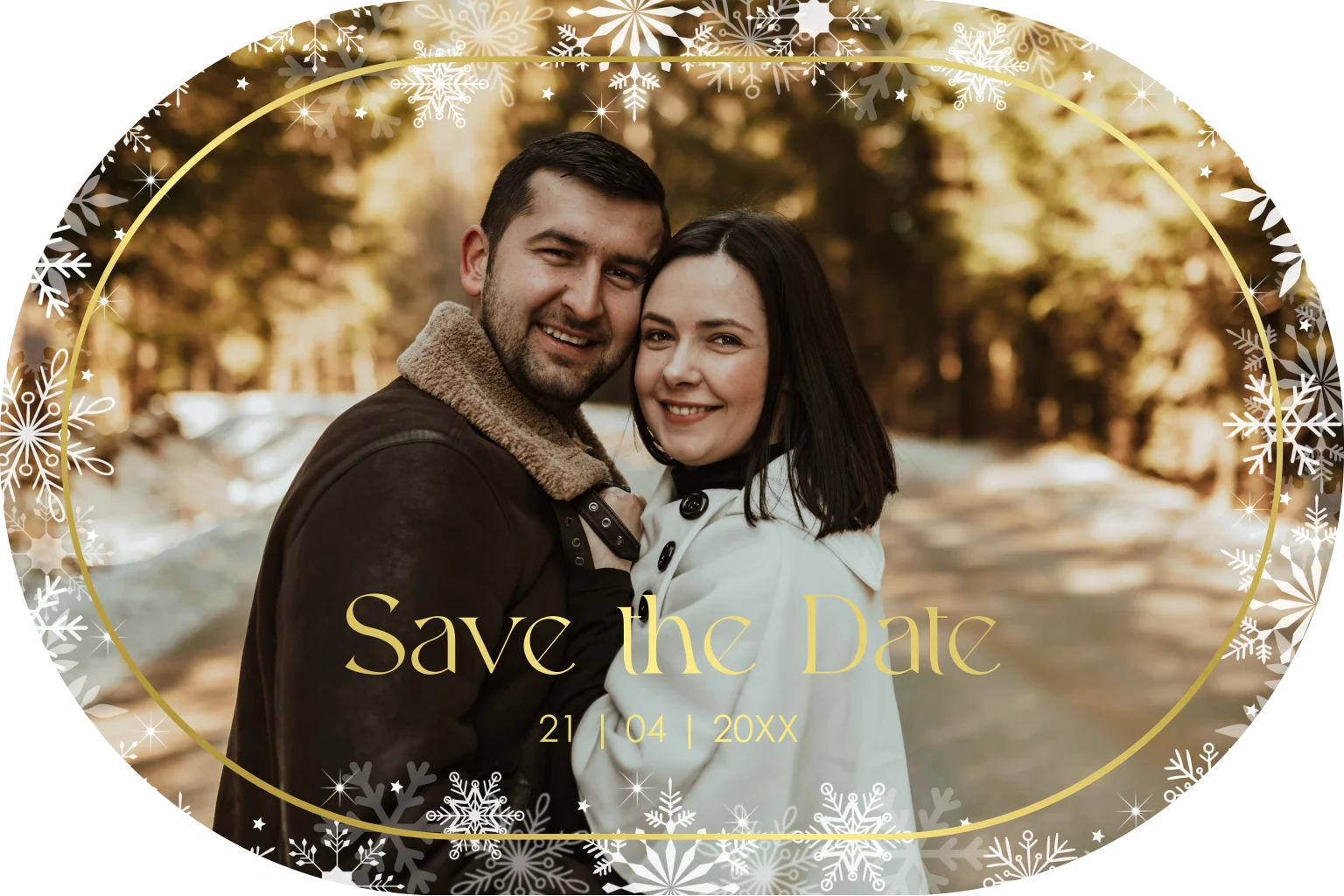 Stijlvolle Save the Date kerstkaart ovaal met eigen foto en goudfolie. Maak jullie trouwdatum bekend met deze luxe save the date!
