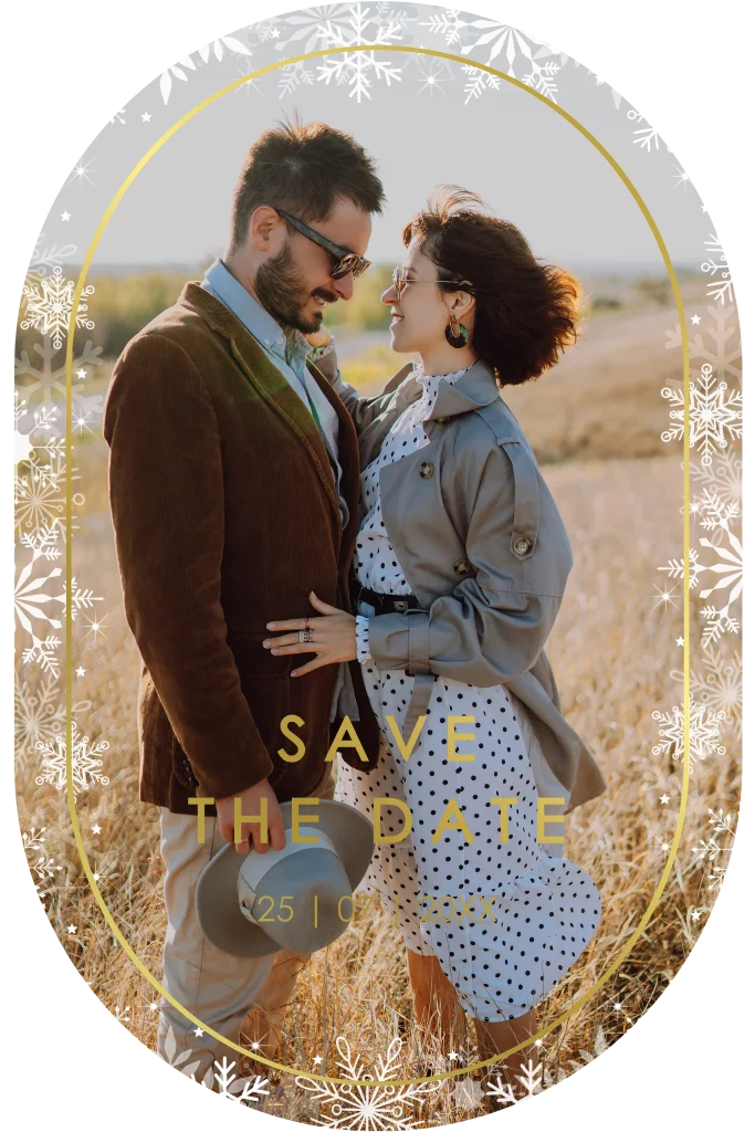 Save the Date kerstkaart in ovaal vorm met eigen foto, sneeuwvlokken en luxe goudfolie.