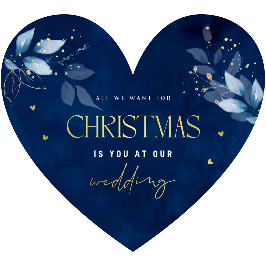 Mooie originele Save the Date kerstkaart in de vorm van een hartje met watercolour bloemen blauw en goudfolie.