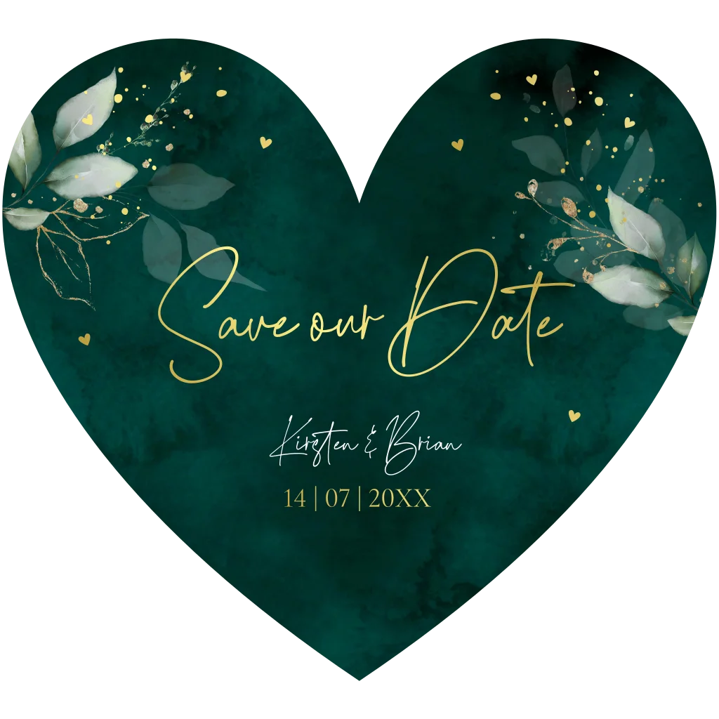 Save the Date kaart hartje groen botanisch blaadjes goudfolie