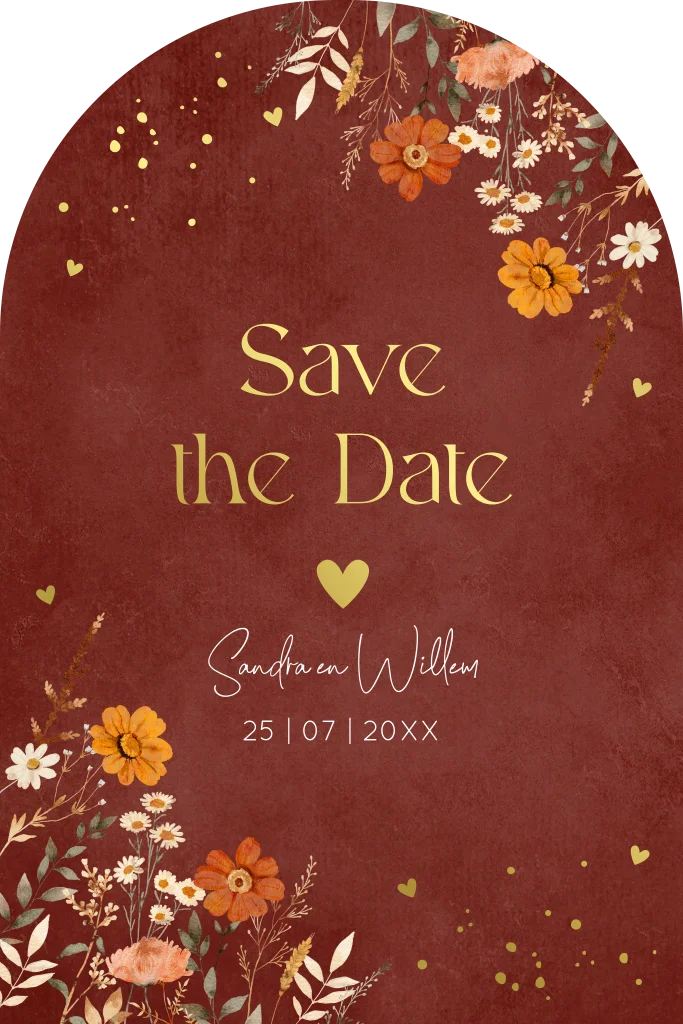 Save the Date kaart rood bruin boog bloemen goudfolie