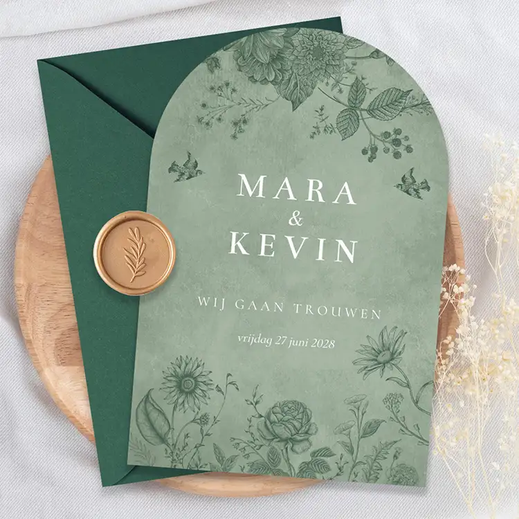 Stijlvolle trouwkaart groen met bloemen en bladeren in boog vorm. Pas de kleuren naar wens aan!