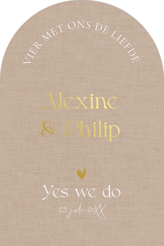 Stijlvolle trouwkaart beige in originele boog vorm met goudfolie. Nodig jullie gasten uit met deze stijlvolle trouwkaart!