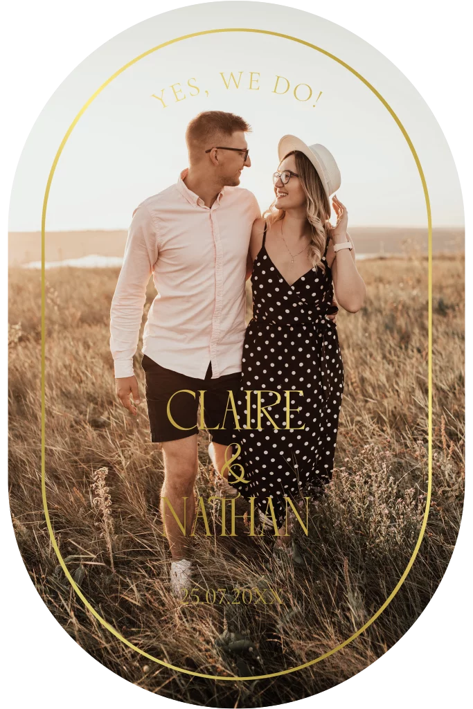 Trouwkaart in speciale ovaal vorm met eigen foto en goudfolie. Nodig jullie gasten uit met deze stijlvolle trouwkaart!